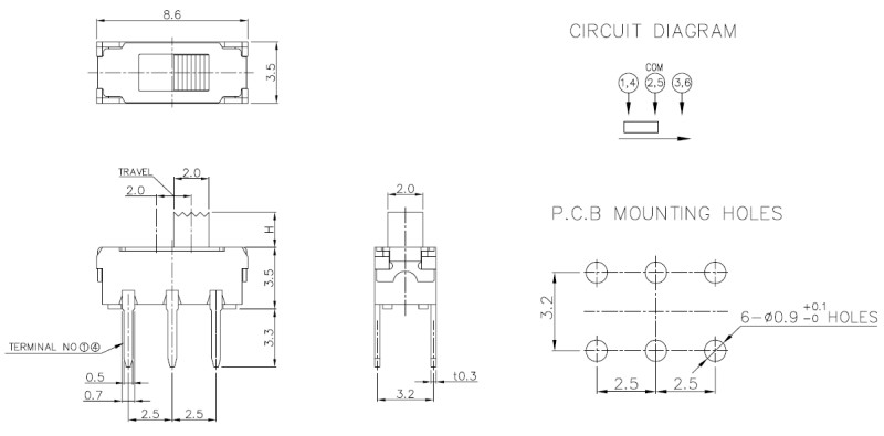 Typical Specifications 1.Rating : DC 6V, 0.3A 2.Circuit : 1C – 2P 3.Timing : NON-SHORTING 4.Travel : 2±0.1mm 5.Contact Resistance : 70mΩMax. 6.Operating Force : 200±100gf 7.Operating Life : 10,000cycles