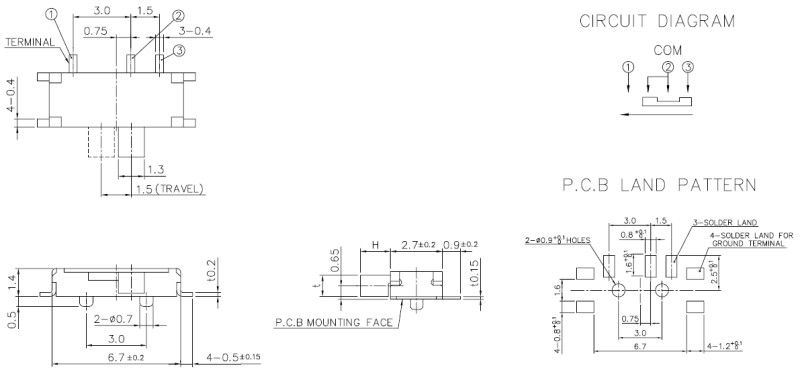 Typical Specifications 1.Rating : DC4V 0.3A 2.Circuit : 1C – 2P 3.Timing : NON-SHORTING 4.Travel : 1.5±0.1mm 5.Contact Resistance : 70mΩMax. 6.Operating Force : 150±100gf 7.Operating Life : 10,000cycles