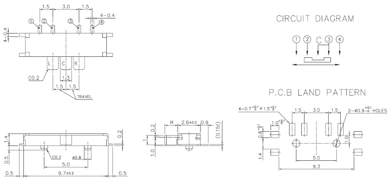 Typical Specifications 1.Rating : DC4V 0.3A 2.Circuit : 1C – 3P 3.Timing : NON-SHORTING 4.Travel : 1.5±0.1mm 5.Contact Resistance : 70mΩMax. 6.Operating Force : * L → C ← R : 200±150gf * L ← C → R : 150±150gf 7.Operating Life : 10,000cycles