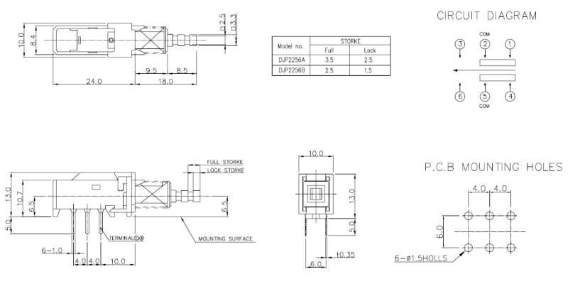 1.Rating : DC25V 1A 2.Circuit : 2C – 2P 3.Contact Resistance : 50mΩMax. 4.Timing : NON-SHORTING 5.Operating Mode : * SELF-LOCK * NON-LOCK 6.Operating Force : 300±100gf 7.Operating Life : 10,000cycles